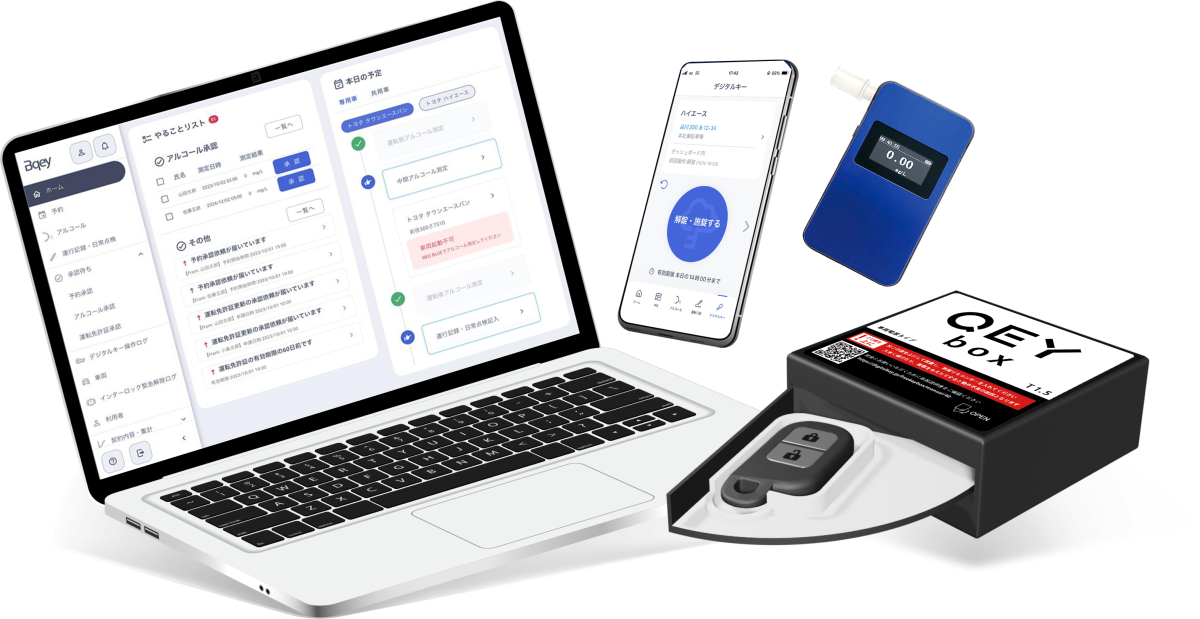 なお、車両管理システムの中には、アルコールチェックの記録管理に加え、チェック未実施の場合や運転者の呼気から基準値を超えるアルコールが検出された場合に、車両の起動を制御し、エンジンを始動させないことで、物理的に飲酒運転を防止できる機能を備えたものもあります。