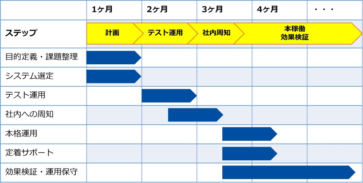 先ほど紹介した3ステップに沿ってどのシステムにするかを選定したら、以下のような流れで導入を進めます