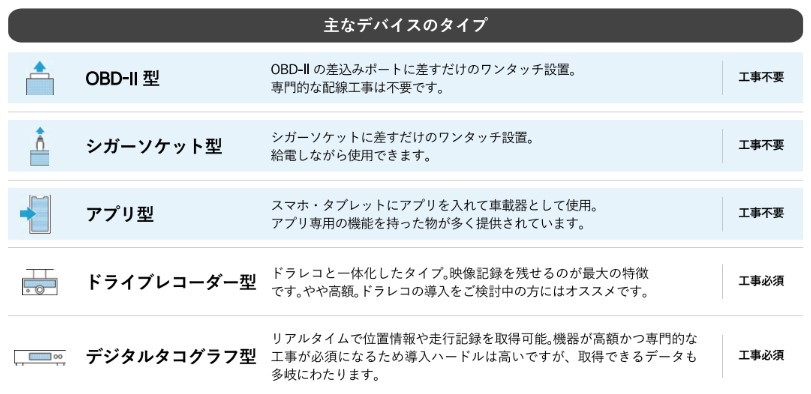 | 目的 | コンプライアンス | コンプライアンス | コンプライアンス | コスト削減 | コスト削減 | コスト削減 | 交通事故削減 | 交通事故削減 | 交通事故削減 | 位置情報把握 | 位置情報把握 | 位置情報把握 | 低コスト | 低コスト | 低コスト |
