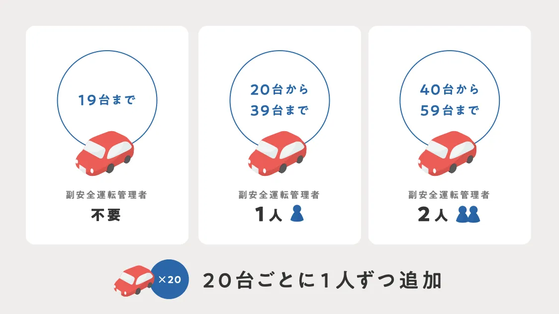 安全運転管理者は最低1人選任していれば問題ありませんが、副安全運転管理者は20台増えるごとに1人加算しなければならないため、注意が必要です。