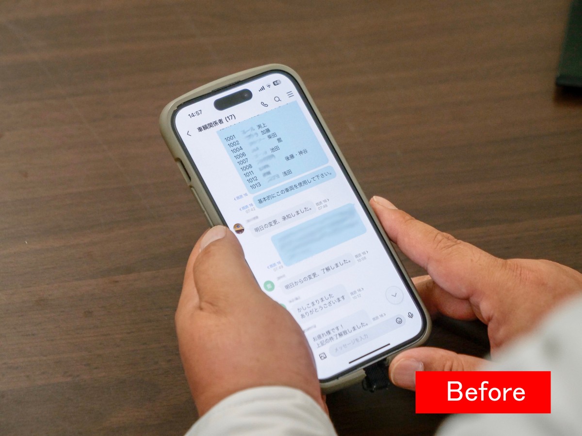 「社用車は、当社の駐車場に停めておく形で管理していました。基本的には、金曜日や休み前に来週の社員の予定を踏まえて、私がスタッフごとの社用車を割り振りLINEで『あなたはこの車を使ってください』と指示を出しており、その作業にも時間がかかっていました。予定変更などイレギュラーな事態が起こった場合のみ、私に連絡がくる形になっていましたので、その際は直接対応していました。紙の予約表での運用も検討しましたが、事務所が閉まってから帰社した場合予約状況の確認ができないことや、利用する車両の変更があったときにすぐ他のメンバーへ共有ができないことから、いつどこにいても最新の予約状況を簡単に確認できるLINEでの運用をしていました。」