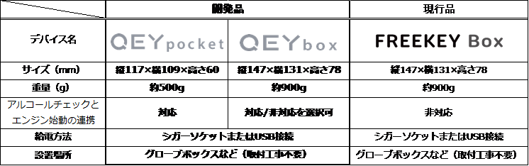 「QEY pocket」と「QEY box」は、「Bqey」に必要不可欠な機能であるデジタルキーを実現している車載デバイス「FREEKEY Box」をアップデートした製品であり、今回のアルコールチェックとエンジン始動の連携機能を可能にしています。「QEY pocket」はエンジン始動連携に加え、現行の「FREEKEY Box」に比べ製品サイズ約50%の小型化を実現し、車室内での搭載の柔軟性を向上させています。また、「QEY box」ではこれまでの「FREEKEY Box」と同じくワイヤレスキーでの使用も可能です。
